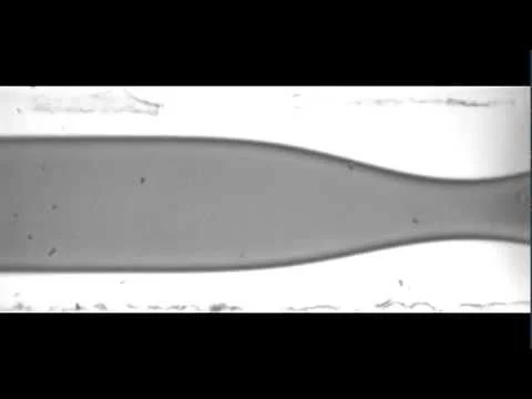 When the dispersed phase penetrates the main channel (channel of the continuous phase) a droplet/bubble starts to grow. Thus the two non miscible fluids form an interface at the junction of the micro-channels. The interface moves in the direction of the continuous phase flow and forms a neck. By the movement of the interface, the neck becomes narrower and narrower until it breaks and forms a droplet/bubble [3] (Fig.2).