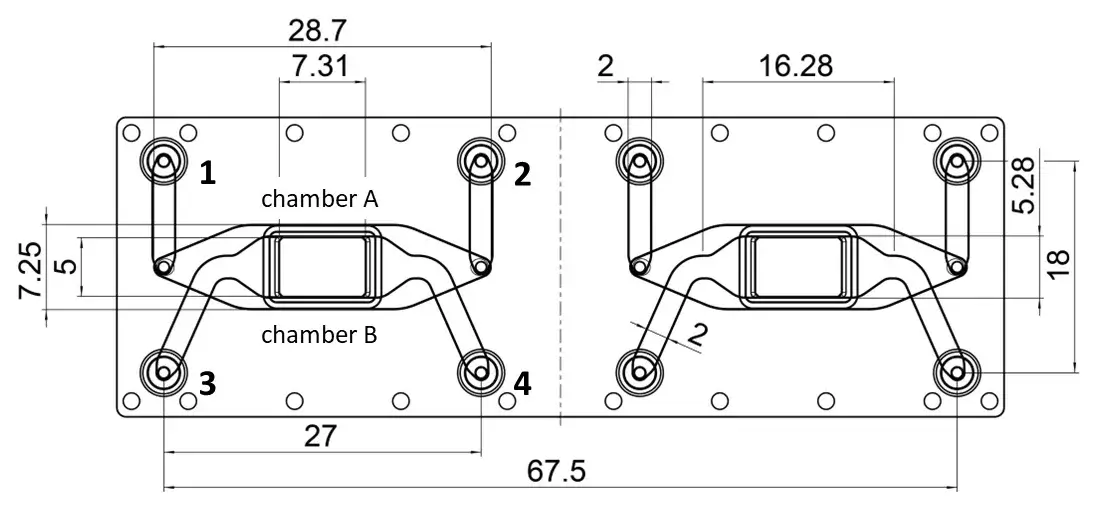 The cross flow membrane microfluidic chip consists of two stacked chambers, each with one inlet and one outlet (ports 1 & 2 feed chamber A, ports 3 & 4 feed chamber B), separated by a porous membrane. Molecular transport can be monitored from one chamber to the other across the membrane by diffusive or active flux. The slide itself offers two independent microfluidic chips, where two independent experiments can be run. The chamber’s Mini Luer interfaces fit microfluidic ChipShop‘s Mini Luer connectors and plugs. Tubing 760 µm OD can be directly pushed into the Mini Luer tube tuck connectors.