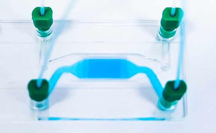 Trypsinize cells from culture flask. Spin down and reconstitute to remove trypsin. Count carefully and prepare cell suspension with cell concentration optimized for your experimental setting. Fill the upper chamber A with cell type A by gently pipetting and fill the lower chamber B with medium. Place the chip in the CO2 incubator for 6 to 24h for the cells to attach under static conditions (incubation time depends on attachment time of different cell types). To prevent the channels from drying out, close all ports with Mini Luer Plugs. Then fill chamber B with cell type B, plug all inlets tightly and turn the chip over. Leave the chip in the CO2 incubator as above for the cells to attach to the membrane. Once the cells are well attached, follow the system purging procedure and connect the chip to flow system. The cross flow membrane chip seeded with cells will allow for example to monitor how cells impact the transport across the membrane or built an organ on chip experimental set-up.