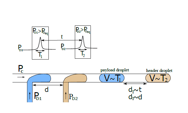 An easy way to generate pairs of header and payload droplets with the ability to vary their size and timing is described in Hamidovic et al., 2018 “Passive droplet control in microfluidic networks: A survey and new perspectives on their practical realization” in Nano Communication Networks [1], and in “First Practical Realization of Switching in Microfluidic Networks” for the 4th Workshop in Molecular Communication [2], presenting an elegant way to generate non-identical droplet pairs. It provides significant improvements to the current state-of-the-art.