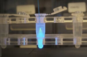To measure the Fluorescein concentration, the optical fiber probe is dipped into the solution. The optical fiber emits blue light and captures green fluorescence light from the Fluorescein diluted in the sample of interest. The fluorescence intensity is translated into Fluorescein density. Between successive measurements, the fiber is rinsed with isopropanol.