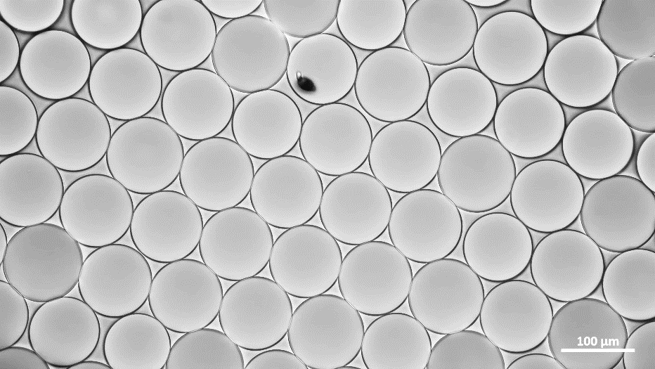 Highly monodispersed alginate beads can be easily generated with a microfluidic droplet generation system.