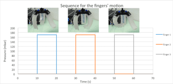 A first sequence was built to control each finger independently (Figure 7), one second to contract the three fingers at a time, and thus allow the grasping of objects (Fig. 8). Further information about the software capabilities on the dedicated software page.