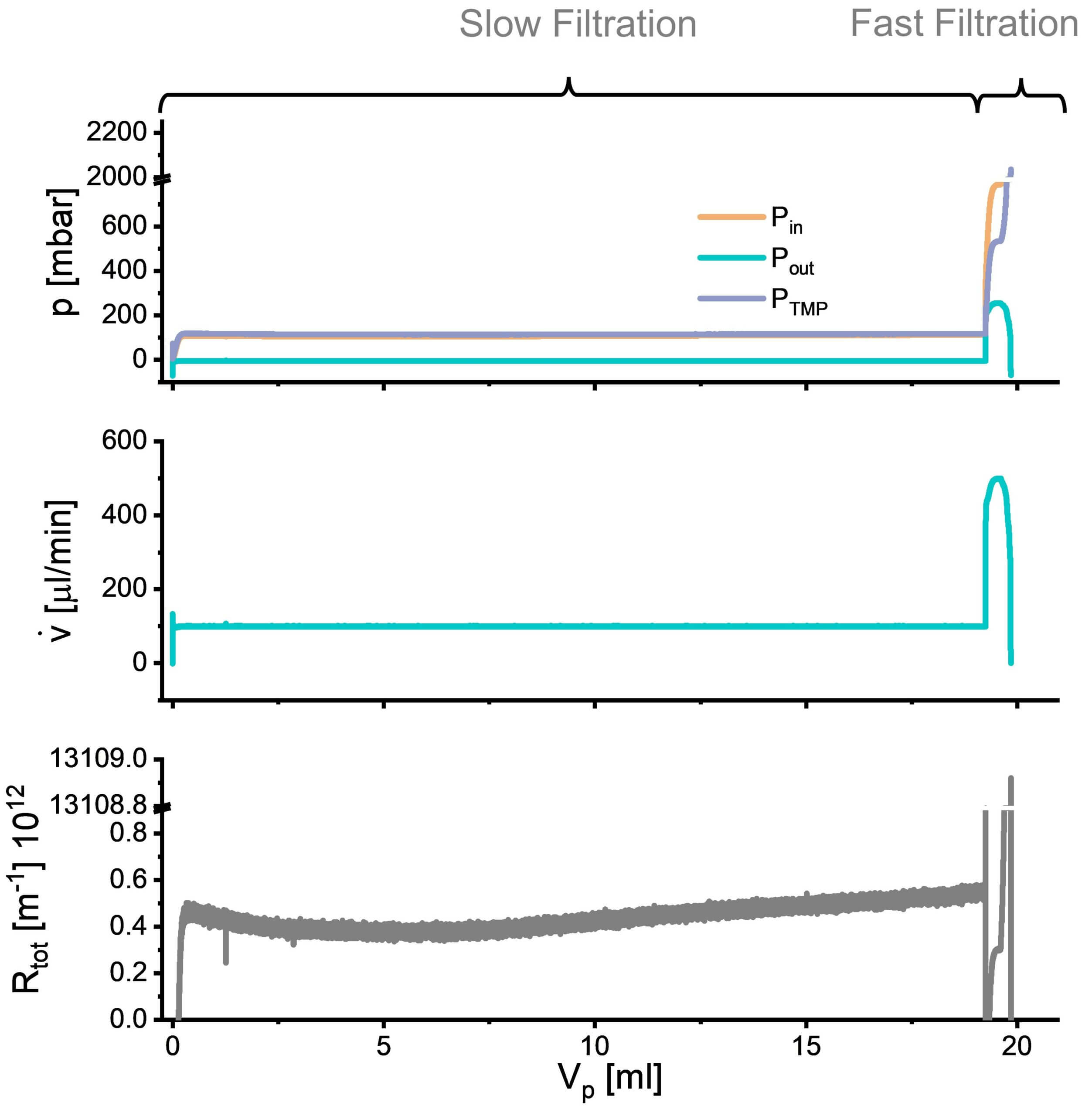 Figure 2. Experimental parameters recorded during a 20 mL filtration of an 1.2 μg mL-1 EA-SWCNT dispersion in 0.006 wt % DOC on a 80 nm pore sized membrane. The volume rates were set to 100 µL min-1 and 500 µL min-1, respectively, while the pressures (Pin, Pout and PTMP= Pin– Pout) are measured and the total resistance Rtot is calculated.