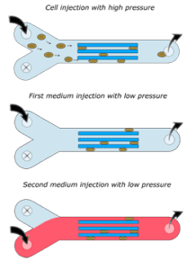 In this case the channel containing cells are thinner ( i.e : 5µm) than the channel used for fluid circulation (i.e. : 50µm). Cells are first injected using high pressure.