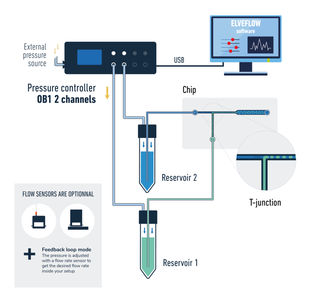 Standard droplet generation with a T-junction can be performed with Elveflow Droplet Pack. The Droplet Pack setup uses 2-channel pumping system to flow independantly dispersed and continuous phases inside the microfluidic chip, enabling water in oil (W/O) or oil in water (O/W) droplets to be generated. The droplet size will be determined by the chip channel size and the flow rate ratio of both phases. Flow rates can be monitored and controlled thanks to our versatile flow rate sensors (MFS or BFS series).